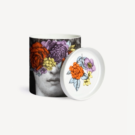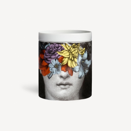 在「花間綺想」家居香氛系列中,Lina Cavalieri 的臉龐被五彩花朵包圍,這些花朵均來自品牌龐大的歷史資料庫,並以原始構圖組合而成,裝飾在這位被 FORNASETTI 品牌譽為古典美理想象徵的傳奇歌劇女伶 Lina Cavalieri 的臉上,形成了色彩繽紛的花叢,喚起鬱鬱蔥蔥的大自然意象。